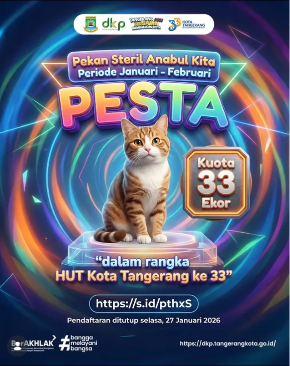 Lokasi: UPTD Puskeswan Kota Tangerang Kuota: TERBATAS HANYA 33 EKOR! (Sesuai angka HUT Kota) Periode Pelaksanaan: Januari - Februari 2026 Syarat Utama: Kucing WAJIB sudah divaksinasi Rabies dalam 12 bulan terakhir (Harap mencantumkan bukti vaksinasi saat pendaftaran). __________________ KETENTUAN PENDAFTARAN: 1. Pemilik wajib memiliki KTP/SUKET Domisili Kota Tangerang. 2. Satu hewan hanya untuk satu KTP/Suket Domisili. 3. Usia hewan minimal 7 bulan. 4. Hewan dalam kondisi sehat (tidak sakit atau sedang pengobatan). 5. Peserta yang terpilih wajib datang tepat waktu sesuai anjuran. 6. Wajib membawa hewan menggunakan petcargo atau keranjang khusus (Dilarang menggunakan kardus atau kotak lainnya). 7. Mengisi formulir pendaftaran sesuai arahan. 8. Nomor telepon yang didaftarkan wajib aktif WhatsApp (WA). 9. Peserta terpilih akan diumumkan via Instagram @dkp.tangerangkota pada H-1 pelaksanaan & akan dihubungi melalui WA. 10. Peserta terpilih wajib melakukan konfirmasi kehadiran melalui WA Puskeswan sebelum jam 15.00 WIB. _________________