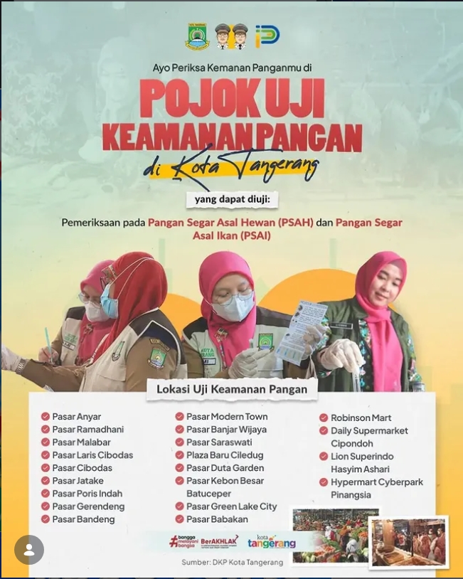 | Description Agenda | Warga Kota Tangerang, Periksa Keamanan Panganmu! Pojok Uji Keamanan Pangan hadir di berbagai pasar dan pusat perbelanjaan Kota Tangerang! |