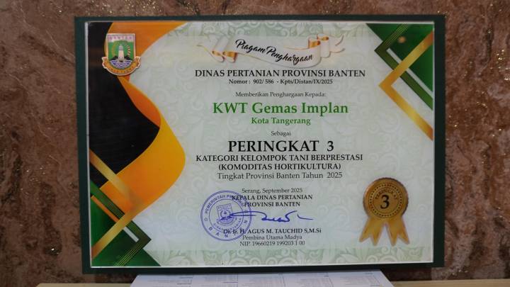 Dinas Ketahanan Pangan (DKP) Kota Tangerang menyampaikan apresiasi dan kebanggaan atas capaian Kelompok Wanita Tani (KWT) Gemas Implan, yang berhasil meraih juara 3 dalam kategori komoditas hortikultura di tingkat Provinsi Banten.